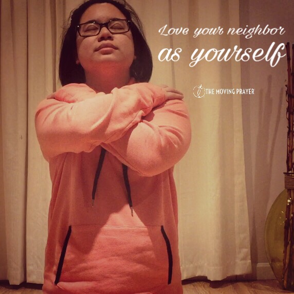 Our last gesture for this sequence. Start once again breathing in and out, thanking God for the life you were given. Place hands in front, ready to receive your gift from God. Share it with others, spreading our arms wide like Christ on the Cross. Then bring our arms straight up, reaching up towards the Heavens, allowing ourselves to be channels of God’s love for others and ourselves! And we end by bringing our arms down into a warm embrace, remembering that while we are channels of God’s love to others, we are also every bit deserving of God’s love for ourselves.